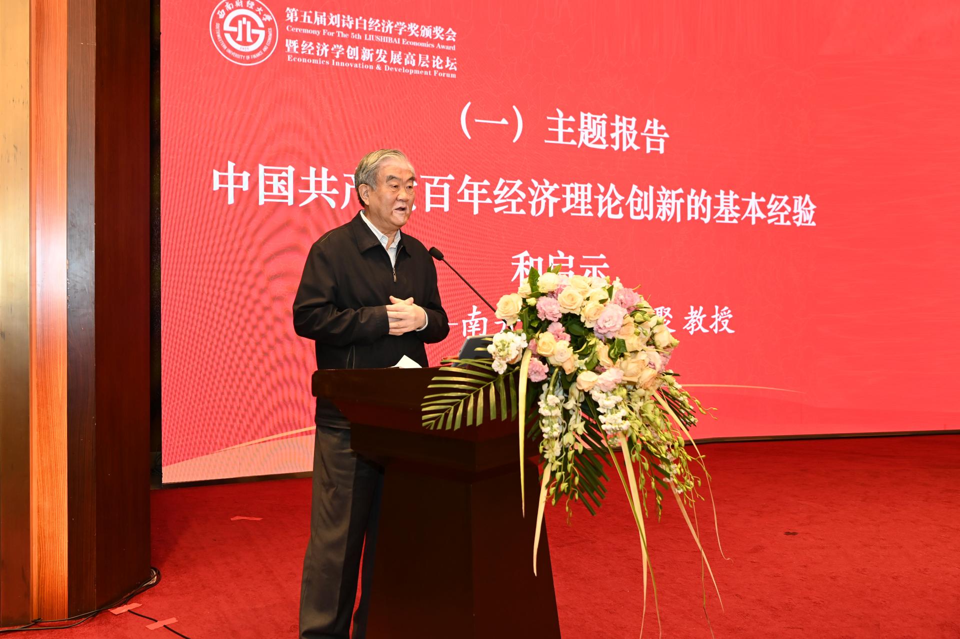 評獎委員會主任洪銀興教授宣讀了西南財經大學名譽校長、著名經濟學家劉詩白教授的賀辭并對第五屆劉詩白經濟學獎的評獎情況進行介紹。本屆“劉詩白經濟學獎”評獎委員會由顧海良等28位著名經濟學家組成,洪銀興任評獎委員會主任,劉詩白任名譽主任。共評選產生十項獲獎成果,分別是對外經濟貿易大學毛捷教授的論文《地方公共債務增長的制度基礎——兼顧財政和金融的視角》,中國社會科學院呂鐵教授的論文《政府干預何以有效:對中國高鐵技術趕超的調查研究》,西南財經大學李萍教授的專著《新中國經濟制度變遷》,清華大學李幫喜副教授的論文《生產結構、收入分配與宏觀效率——一個馬克思主義政治經濟學的分析框架與經驗研究》,中山大學楊子暉教授的專著《政策工具的擠出效應與擠入效應研究》,南京大學鄭江淮教授的論文《中國經濟增長新舊動能轉換的進展評估》,廣東外語外貿大學易行健教授的專著《中國居民消費儲蓄行為研究(宏觀證據與國際比較、基于異質性視角的微觀證據)》,復旦大學高帆教授的專著《從割裂到融合:中國城鄉經濟關系演變的政治經濟學》,武漢大學郭熙保教授等的專著《邁向高質量發展的經濟結構轉變研究》,中國人民大學謝富勝教授的論文《平臺經濟全球化的政治經濟學分析》。顧海良、洪銀興、逄錦聚、卓志、劉燦、劉家強等嘉賓分別為獲獎者頒獎。武漢大學郭熙保教授作為獲獎者代表發言。
