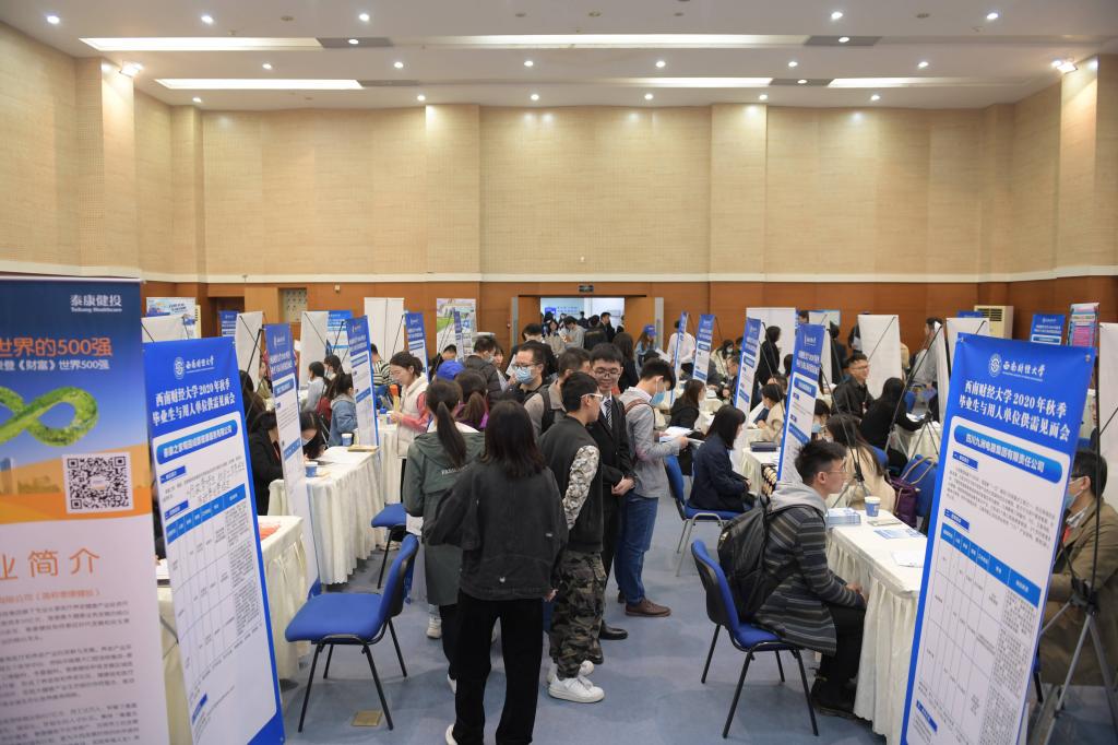 11月20日,西南財經(jīng)大學(xué)2020年第二場畢業(yè)生與用人單位供需見面會在柳林校區(qū)學(xué)生活動中心舉行。來自四川、廣東、北京、江蘇等17個省市的101家用人單位齊聚我校廣攬英才,提供就業(yè)實習(xí)崗位2186個,吸引了2000余名應(yīng)往屆畢業(yè)生參會。