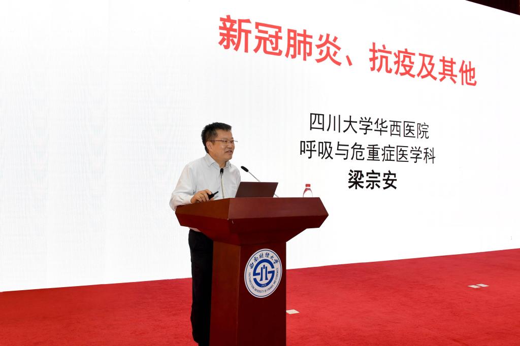 9月29日下午,“青春在戰疫中綻放”——開學第一堂團課在弘遠樓105會議室舉行。學校黨委副書記曾道榮,全體團干部,主要學生組織負責人,2019級、2020級全體團支書等400余人在現場參加了主題團課;部分學院組織團支部、第22屆研究生支教團組織當地學生通過線上直播形式參與了團課,共3800余名團員青年聆聽團課。團課由全國優秀共產黨員、全國抗擊新冠肺炎疫情先進個人、四川大學華西醫院呼吸與危重癥醫學科主任梁宗安教授主講。