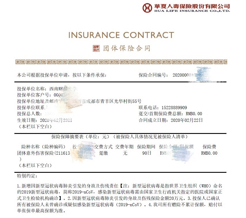 社會各界紛紛慷慨解囊,向學校伸出援手。北京中瑞誠公益基金會捐贈84消毒液;廣東順德萊雅化工捐贈空氣清新劑;中國建設銀行股份有限公司成都溫江支行捐贈N95口罩、防護服、乳膠手套等;華夏人壽保險股份有限公司為1476名沖鋒在一線的學校醫務、保衛、后勤防疫工作者送來貼心保障,分別捐贈200000元/人的新冠肺炎身故、傷殘個人險及5000元/人的團體意外傷害保險一份。四川省教育廳調撥捐贈一次性口罩、熱成像雙光譜筒型網絡攝像機;溫江區教育局調撥捐贈一次性口罩;溫江海科社區捐贈次氯酸鈉消毒液。