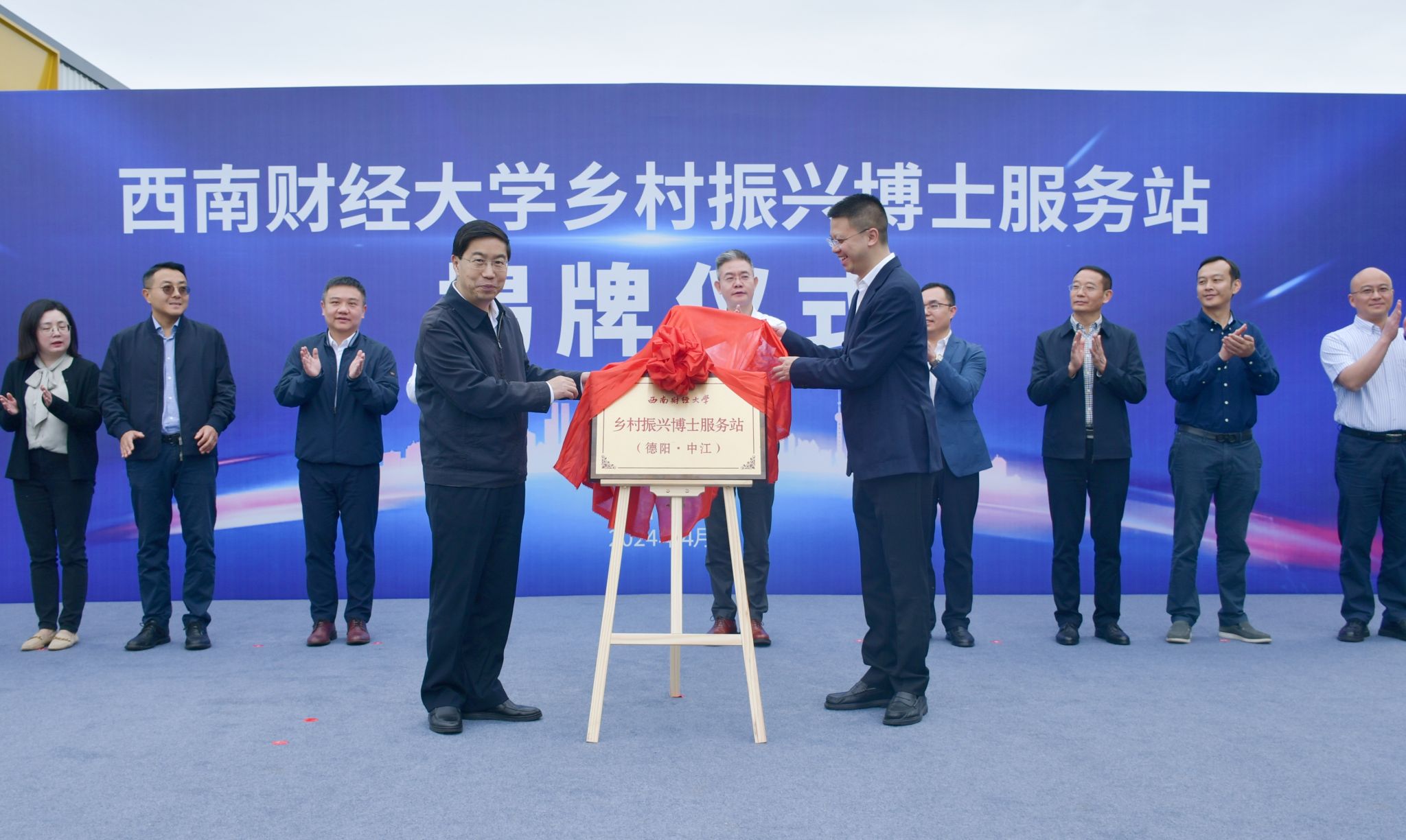 趙建軍與魏宇共同為西南財經大學鄉村振興博士服務站(德陽·中江)揭牌。