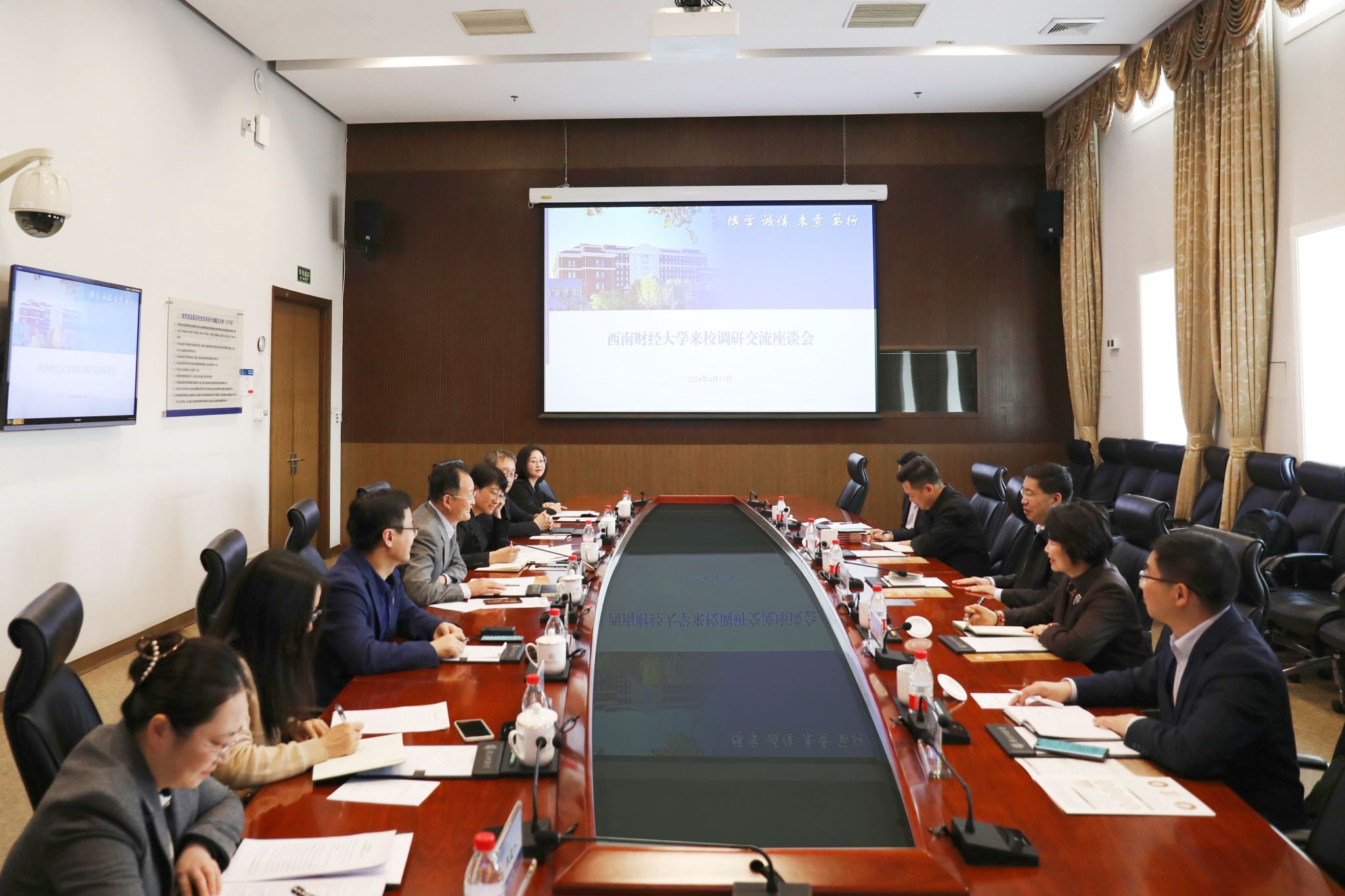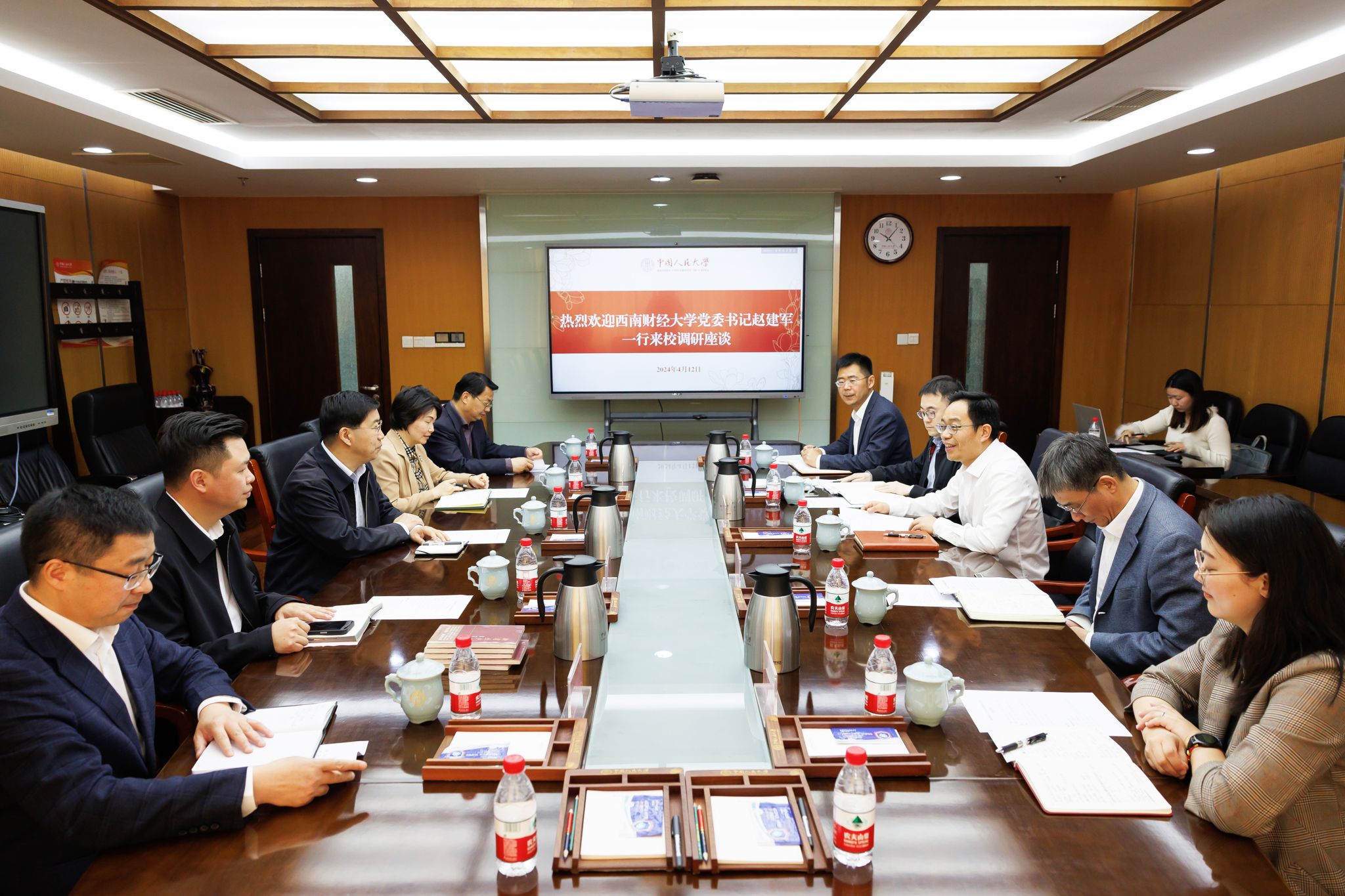 在中國人民大學交流時,張東剛對我校一行的到來表示歡迎,并簡要介紹了中國人民大學的歷史沿革和學校發展情況。他表示,中國人民大學堅持“黨辦的大學讓黨放心、人民的大學不負人民”辦學理念,與西南財經大學“經世濟民、孜孜以求”的辦學使命相互契合;希望兩校在良好的合作基礎之上,未來在高層次人才和干部交流、研究生培養、人文學科建設等方面深化務實合作,共同答好時代發展的重大命題。趙建軍表示,中國人民大學是“我國人文社會科學高等教育領域的一面旗幟”,學校始終堅持扎根中國大地辦大學,在長期的辦學實踐中,為黨和國家事業發展培養了大批優秀人才。中國人民大學在學科建設、人才隊伍建設、人才培養等方面擁有豐富經驗,為我校提供了很好的借鑒,希望雙方進一步加強溝通交流,深化學科建設、人才培養、科研等領域合作,攜手建設中國特色世界一流大學。