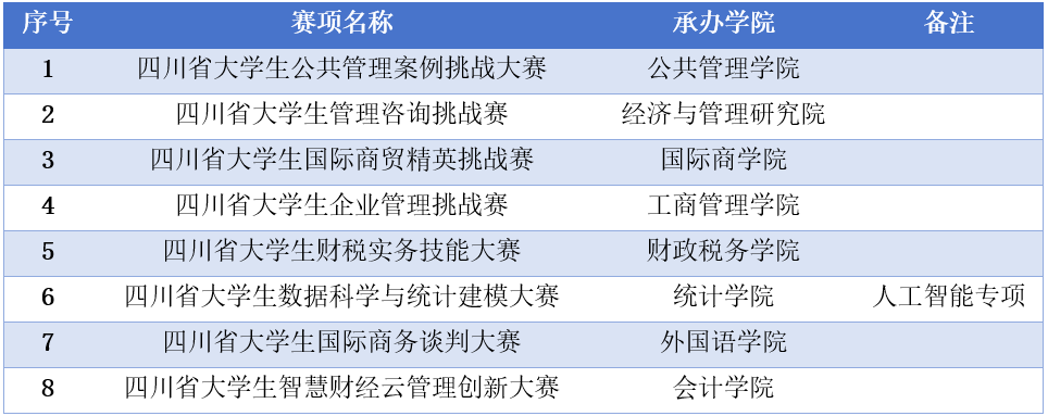 近日,四川省教育廳公布2024年省級本科高校大學(xué)生競賽項(xiàng)目評選結(jié)果,我校申報(bào)的“四川省大學(xué)生公共管理案例挑戰(zhàn)大賽”“四川省大學(xué)生管理咨詢挑戰(zhàn)賽”等8個(gè)競賽項(xiàng)目,經(jīng)專家評審和網(wǎng)上公示后獲批立項(xiàng)。本年度全省累計(jì)97個(gè)競賽項(xiàng)目獲批,我校在立項(xiàng)數(shù)量上位居全省高校第二,取得重大突破。