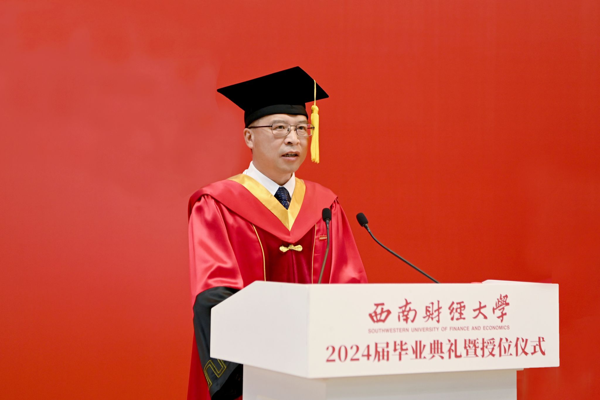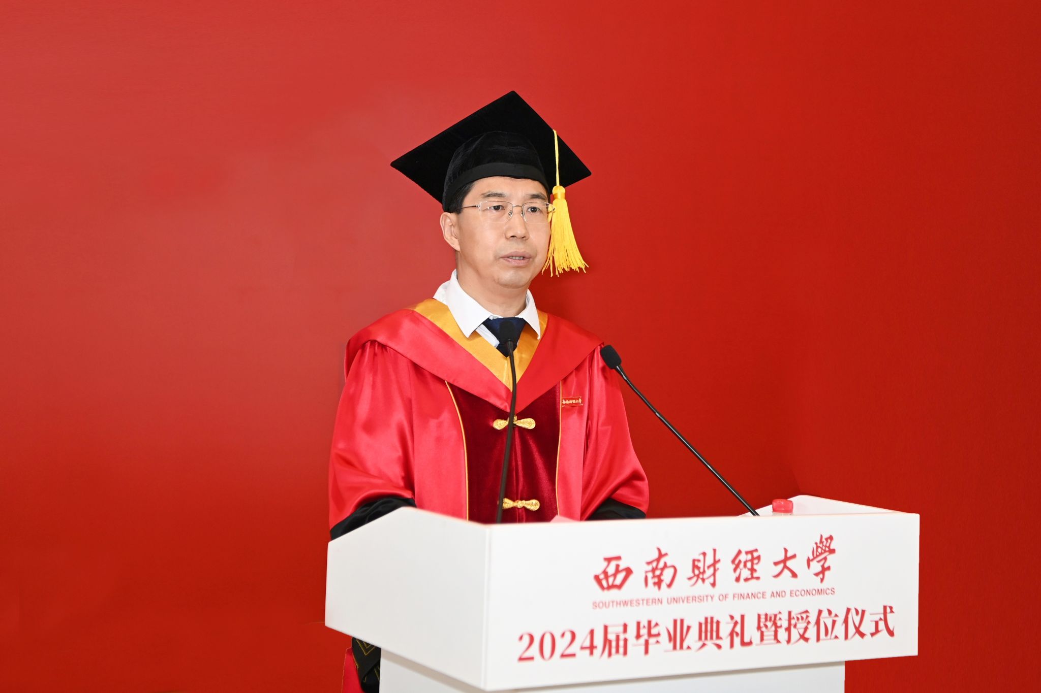 趙建軍主持典禮時(shí)指出,“經(jīng)世濟(jì)民、孜孜以求”的西財(cái)精神,既蘊(yùn)含著一所大學(xué)“教育報(bào)國(guó)”的崇高使命,又飽含著全體師生“愛國(guó)奉獻(xiàn)”的信念追求,還彰顯著財(cái)經(jīng)學(xué)科的底蘊(yùn)特色,是每一名西財(cái)人奮進(jìn)拼搏的思想源泉和不竭動(dòng)力。他深情勉勵(lì)畢業(yè)生在今后的人生之路上傳承好西財(cái)精神,做行動(dòng)派、當(dāng)實(shí)干家,在強(qiáng)國(guó)建設(shè)、民族復(fù)興偉業(yè)中貢獻(xiàn)西財(cái)青春力量。趙建軍寄語西財(cái)青年,要樹立“經(jīng)世報(bào)國(guó)”的遠(yuǎn)大志向,以理想為帆、奮斗為槳,堅(jiān)定不移聽黨話、跟黨走,把準(zhǔn)人生方向,積極投身強(qiáng)國(guó)建設(shè)、民族復(fù)興偉業(yè),在“強(qiáng)國(guó)有我”的實(shí)踐中不斷提高本領(lǐng)能力,自覺在以中國(guó)式現(xiàn)代化全面推進(jìn)中華民族偉大復(fù)興的嶄新征程中挺膺擔(dān)當(dāng)。要厚植“濟(jì)民安邦”的為民情懷,涵養(yǎng)“我將無我”的境界、扛牢“不負(fù)人民”的責(zé)任,堅(jiān)持人民至上,在工作崗位上深入基層、深入群眾,既向人民群眾學(xué)習(xí),更解決他們的急難愁盼問題,自覺做到民之所憂,我必念之;民之所盼,我必行之。要錘煉“孜孜以求”的堅(jiān)韌品格,以奔騰不息的動(dòng)力、上下求索的毅力,干一行、愛一行、鉆一行,勇于做先鋒、當(dāng)闖將,在急難險(xiǎn)重中強(qiáng)壯筋骨,在摸爬滾打中增長(zhǎng)才干,迎難而上、艱苦奮斗、堅(jiān)韌不拔,一步一個(gè)腳印,在新時(shí)代新征程上留下無悔的青春足跡。
