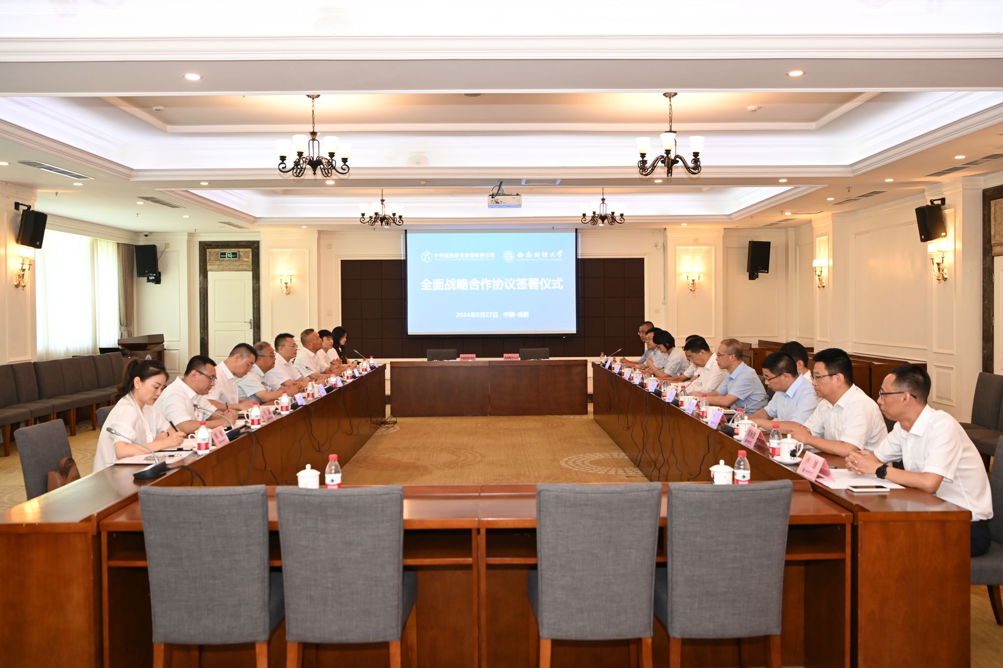 8月27日,學校與中經城投建設集團有限公司全面戰略合作協議簽署儀式在光華校區舉行。學校黨委書記趙建軍,黨委副書記、校長李永強,黨委常委、副校長桂富強;中經城投建設集團有限公司董事長婁德蘭、總裁助理李超,中經城投建設集團四川有限公司董事長陳川、總經理周繼武出席儀式。