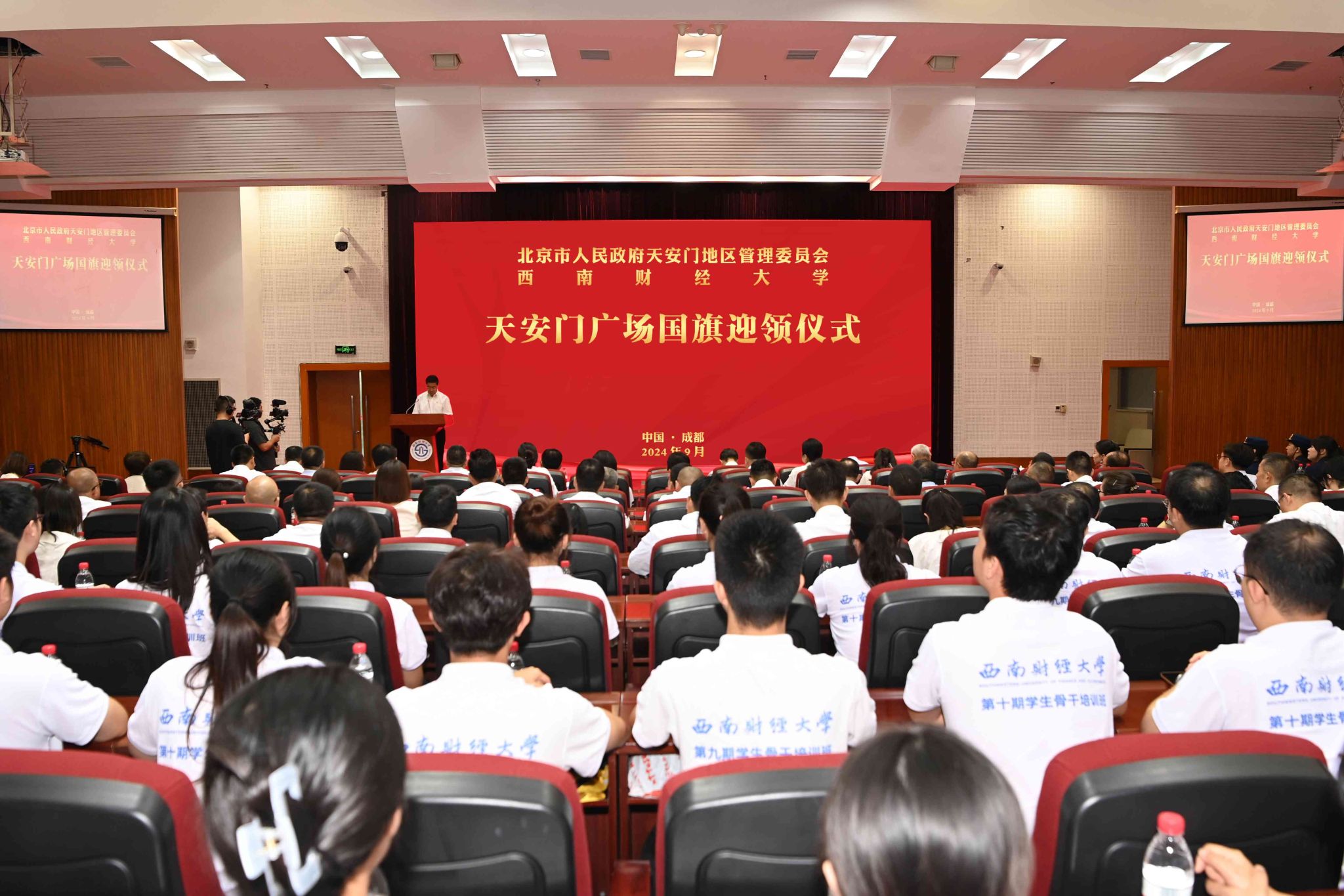 9月7日,西南財經(jīng)大學(xué)在柳林校區(qū)騰驤樓137會議室舉行莊重儀式,迎領(lǐng)天安門廣場國旗。天安門地區(qū)管理委員會黨組成員、副主任(正局長級)姚輝和相關(guān)負責(zé)人、干部;學(xué)校黨委書記趙建軍,黨委原副書記、百年校慶籌備工作辦公室常務(wù)副主任曾道榮,黨委副書記明海峰,黨委常委、副校長馬永強和相關(guān)職能部門負責(zé)人、各學(xué)院(研究院)負責(zé)人、師生代表、國旗班成員等參加儀式。姚輝、趙建軍分別致辭。馬永強主持儀式。