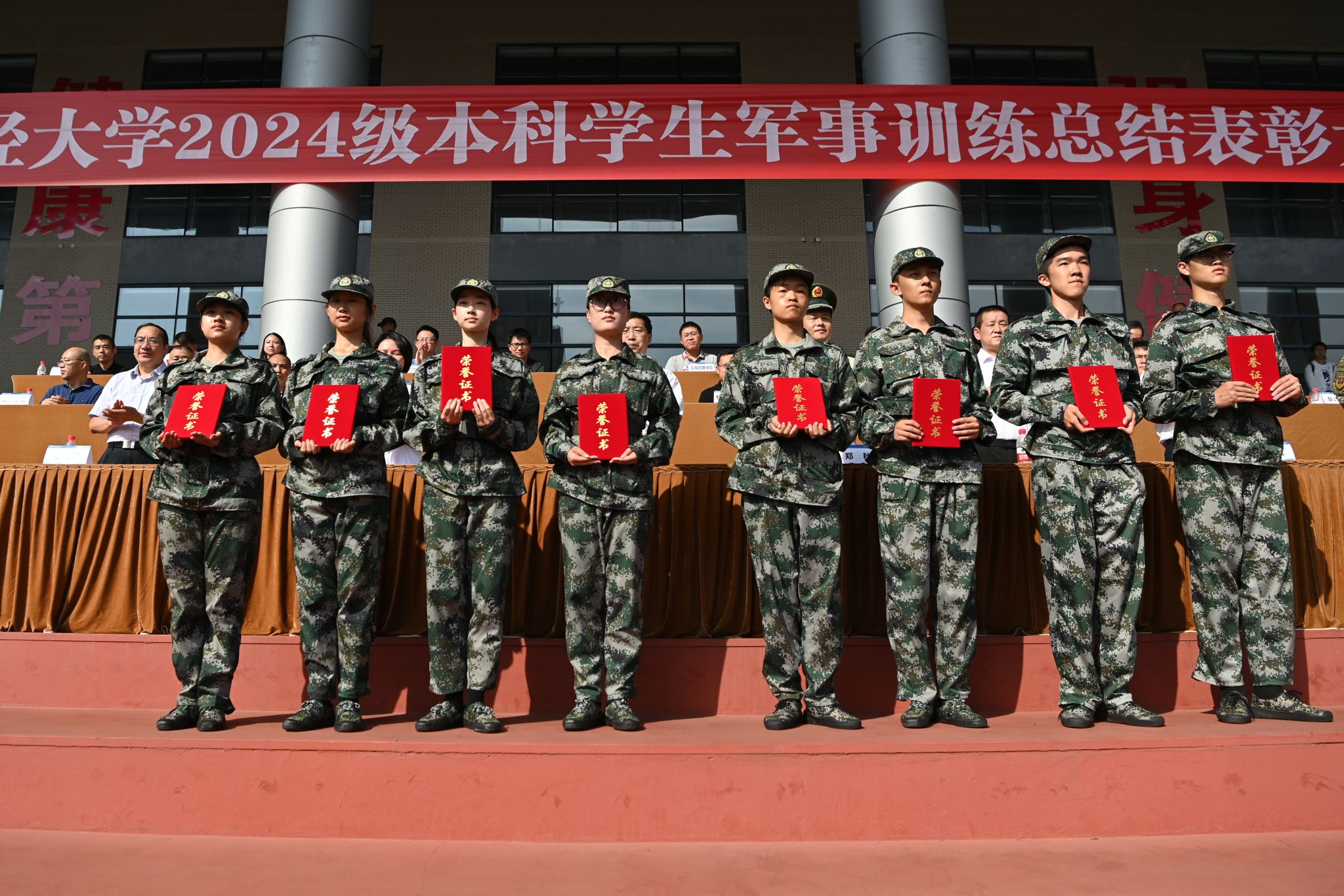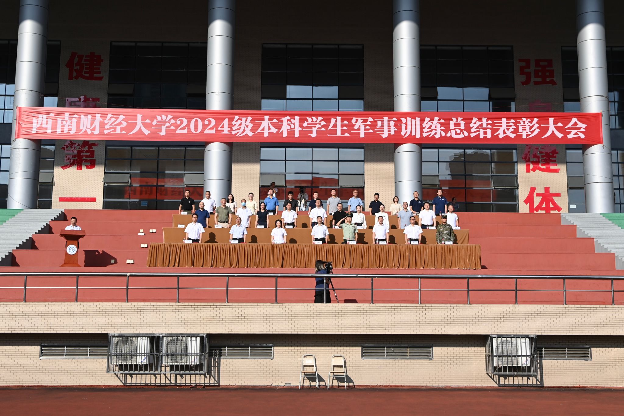9月22日,學校2024級本科學生軍訓總結表彰大會在柳林校區(qū)晨曦運動場舉行。學校黨委書記趙建軍,黨委副書記謝紅、明海峰,黨委常委、副校長史代敏、李志生、王擎,武警成都支隊領導、學校軍訓工作領導小組成員單位負責人及各本科教學單位相關負責人參加大會。