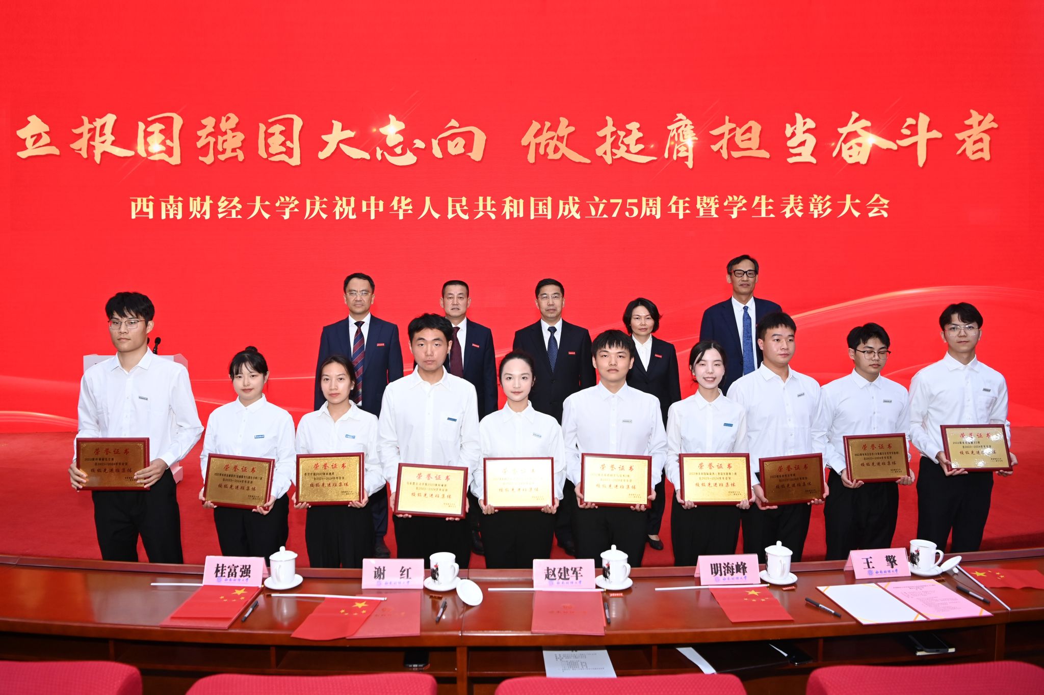 萬眾歡騰歌盛世,共祝祖國更輝煌。9月29日下午,西南財經大學在柳林校區弘遠樓105報告廳舉行大會,隆重慶祝中華人民共和國成立75周年,表彰一批學生先進集體和優秀個人。黨委書記趙建軍,黨委副書記謝紅、明海峰,黨委常委、副校長桂富強、王擎出席大會。