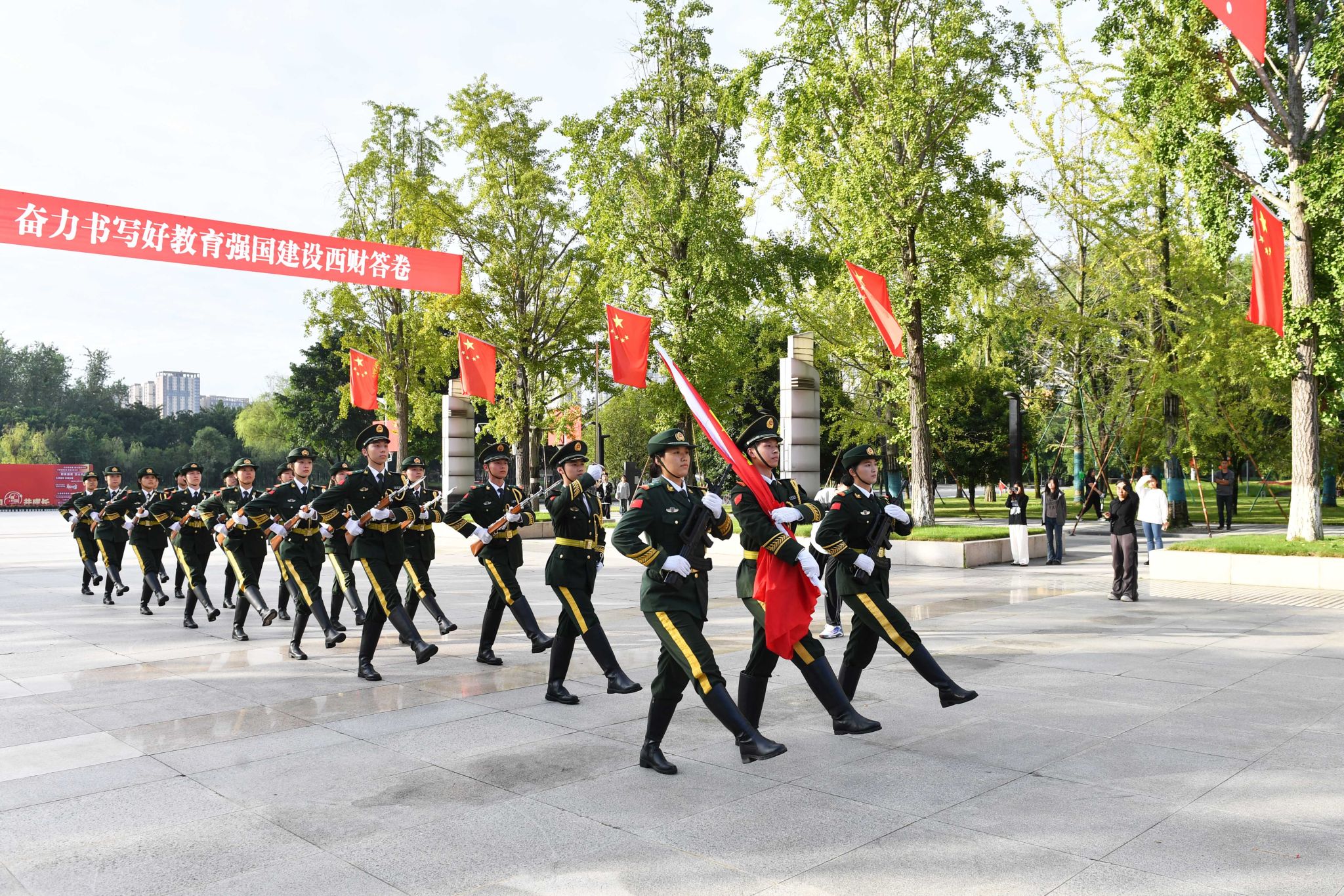伴隨著雄壯激昂的《義勇軍進行曲》,五星紅旗冉冉升起,那一抹飄揚在長空里的中國紅,點燃每一個西財人的愛國心、報國情、強國志。師生們目光如炬,共同凝視著那面代表著國家尊嚴與榮耀的五星紅旗,共同祝愿祖國繁榮昌盛,人民幸福安康!
