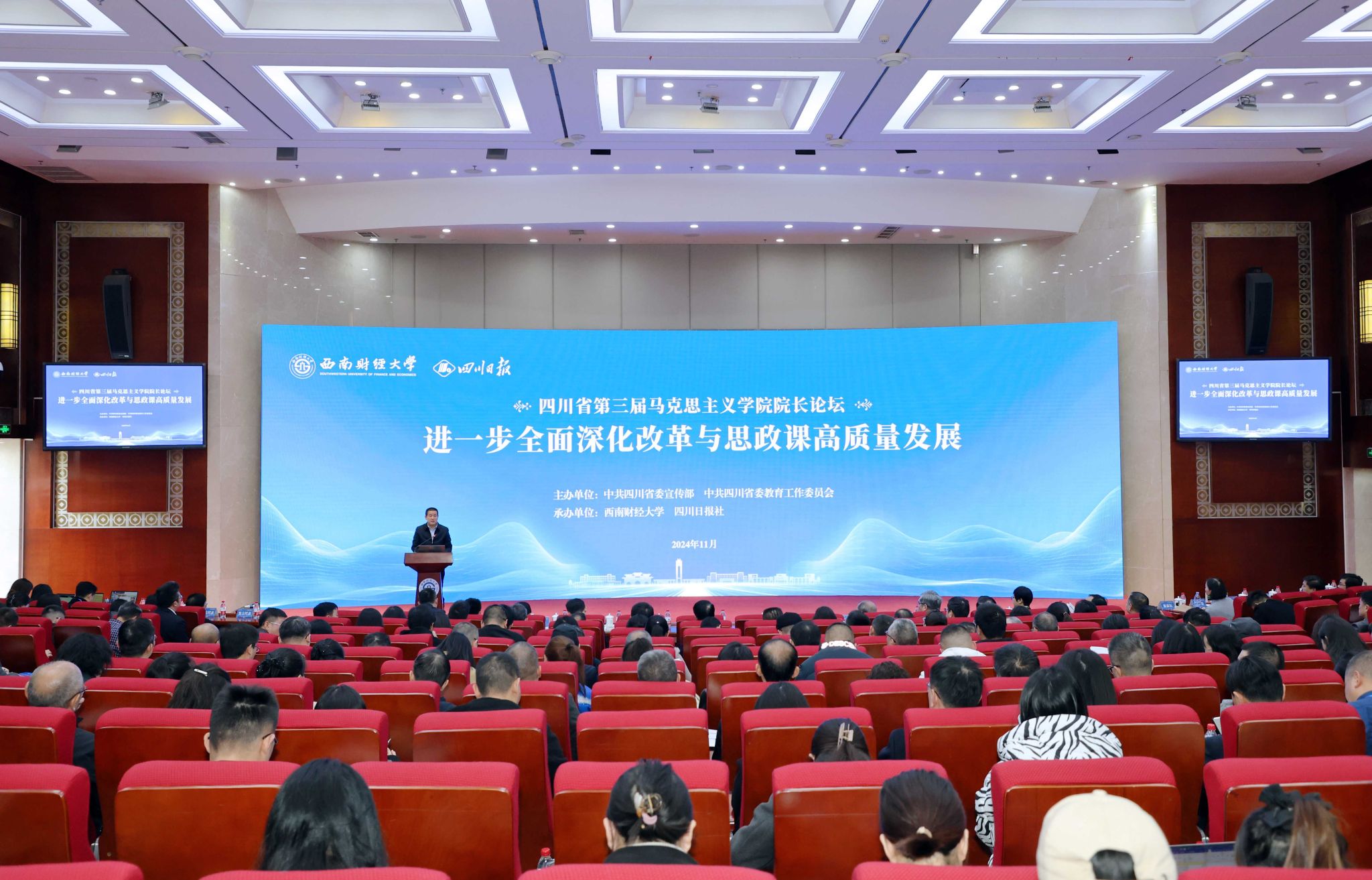 為深入貫徹落實黨中央和四川省委關于加強新時代馬克思主義學院建設的部署要求,11月25日,由中共四川省委宣傳部、四川省委教育工委主辦,西南財經大學和四川日報報業集團承辦的四川省第三屆馬克思主義學院院長論壇在柳林校區成功舉辦。來自四川省內外130余所高校、黨校以及社科研究機構的專家學者、馬克思主義學院負責人及師生代表300余人匯聚一堂,圍繞“進一步全面深化改革與思政課高質量發展”主題開展深入研討。