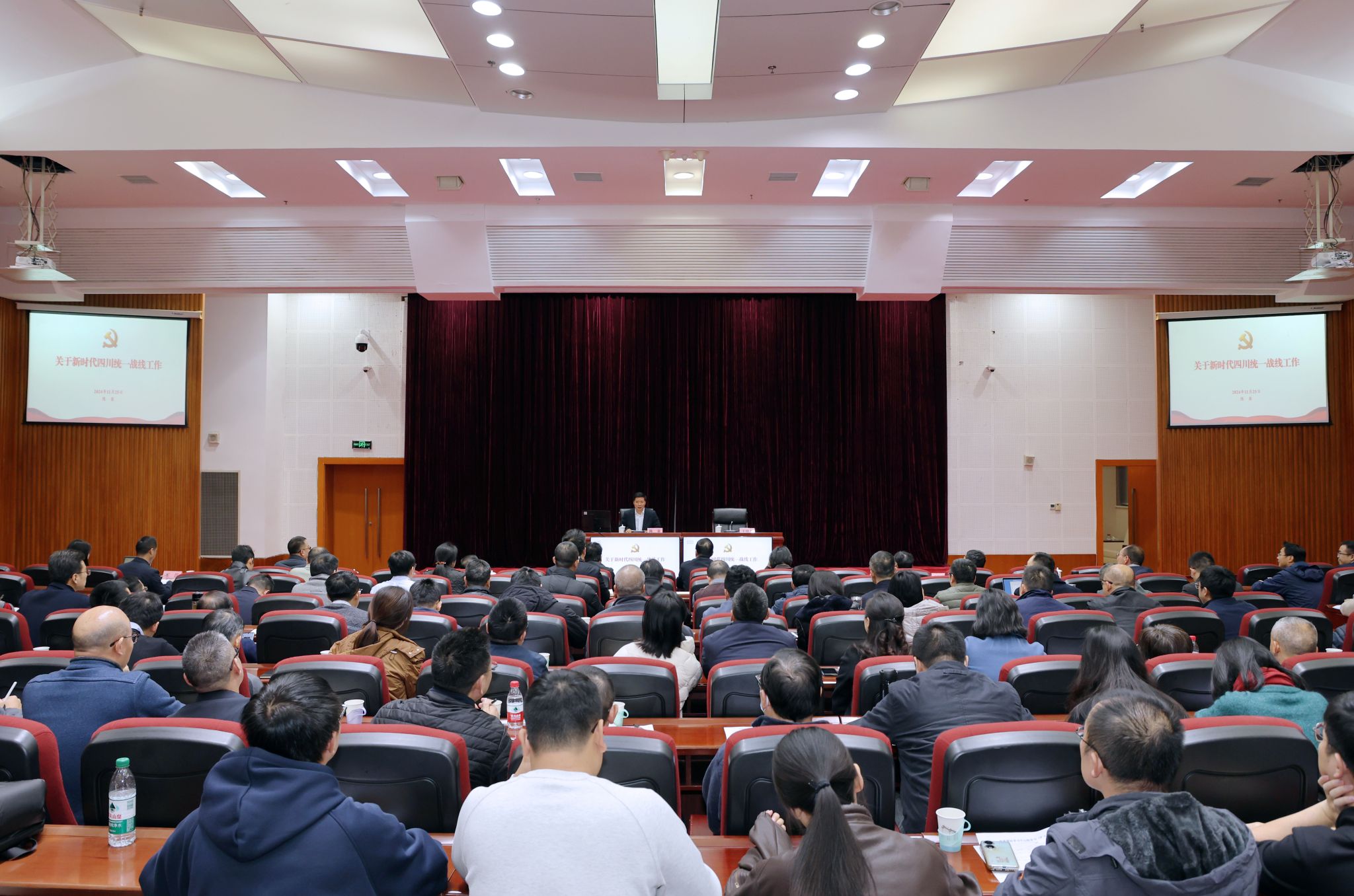 會議邀請四川省委統戰部常務副部長陳泉作《新時代四川統一戰線工作》專題報告,圍繞統一戰線的內涵、工作范圍、當前形勢分析、具體工作領域以及四川統戰工作開展情況等方面,詳細闡述了統一戰線的發展階段、特殊地位、重要作用、工作要求,明確了四川統戰工作的具體實施路徑和高校統戰工作思路。報告主題鮮明、內容豐富、闡釋精準,具有很強的政治性、理論性、實踐性,既是一堂生動的思政大課,也是一堂實踐指導課,對于全校師生進一步深刻領會中國共產黨在統一戰線工作中總攬全局、協調各方的領導地位,更好傳承紅色基因、學思踐悟中國共產黨人精神譜系具有十分重要的指導意義。