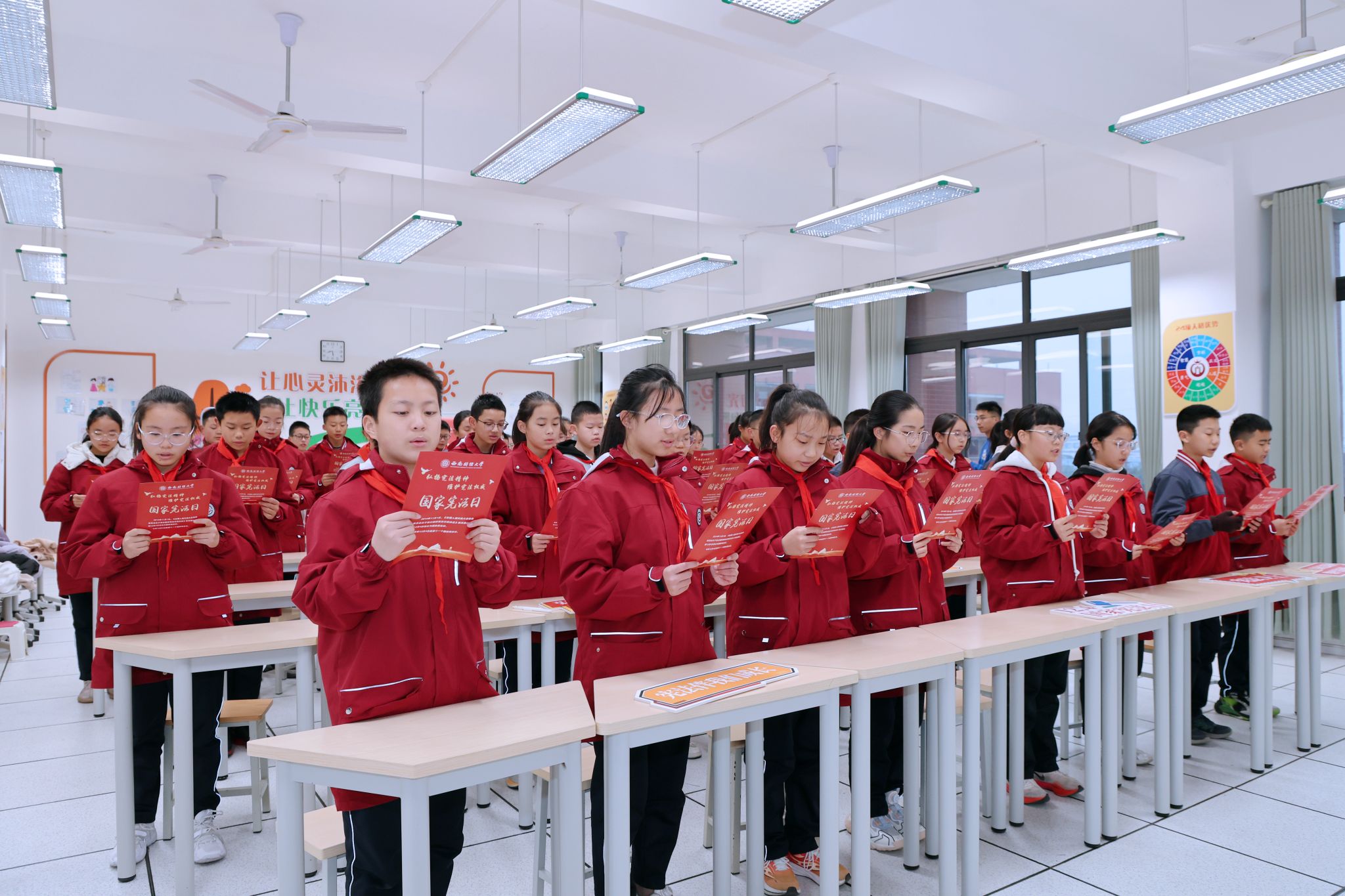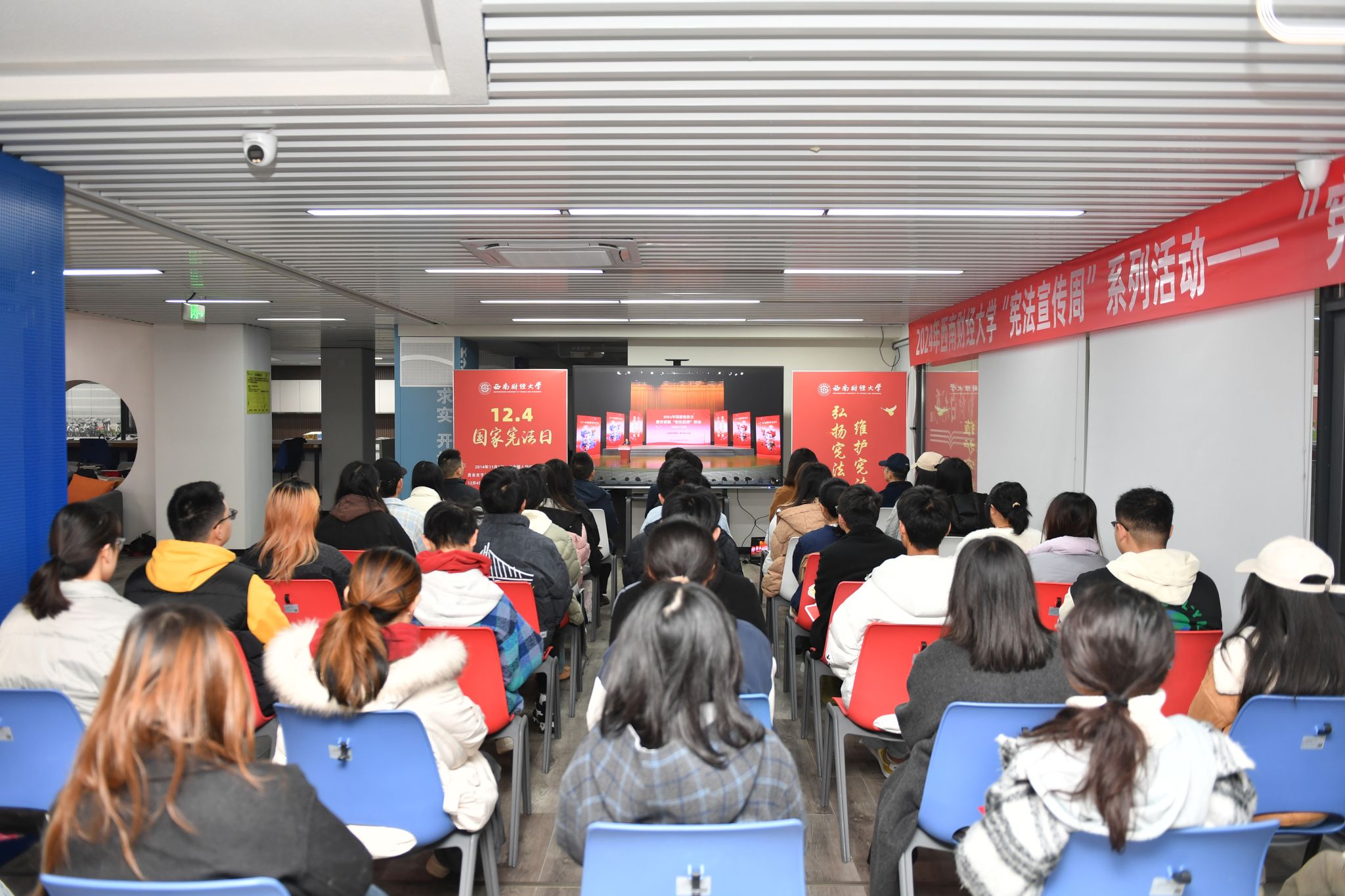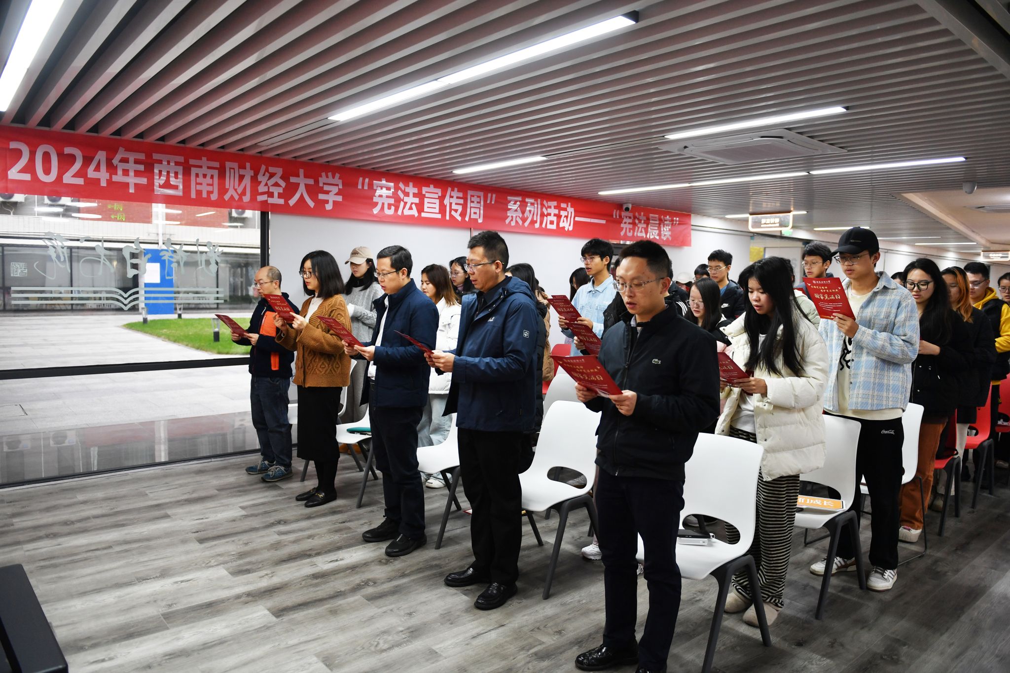 12月4日是第十一個(gè)國(guó)家憲法日。為深入學(xué)習(xí)踐行習(xí)近平法治思想,認(rèn)真貫徹黨的二十大和二十屆二中、三中全會(huì)以及全國(guó)教育大會(huì)精神,加強(qiáng)憲法法治教育,12月4日上午,國(guó)家憲法日教育系統(tǒng)“憲法晨讀”活動(dòng)舉行。教育部在北京設(shè)主會(huì)場(chǎng)。學(xué)校在柳林校區(qū)劉詩(shī)白書院“一站式”學(xué)生社區(qū)和西南財(cái)經(jīng)大學(xué)附屬實(shí)驗(yàn)中學(xué)設(shè)分會(huì)場(chǎng)。