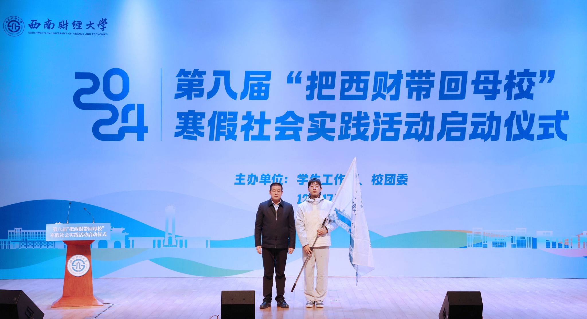 明海峰為第八屆“把西財帶回母校”寒假社會實踐隊伍學生代表授旗,并提出殷切期望。他指出,招生宣傳是學校面向社會的一扇窗口,是“四環聯動”培育時代新人的重要環節,要用智慧去謀劃、用責任去擔當、用愛心去服務。他強調,各實踐隊伍要充分展現西財學子自信風貌和卓越風采,在百年校慶歷史榮光中滿懷自豪感和責任感,在卓越教育深厚積淀中展現學校辦學實力和教育魅力,在社會實踐廣闊舞臺上砥礪奮進、知行合一,充分搭建起學校與全國各地生源中學之間的溝通橋梁,為學校招生宣傳工作貢獻力量。