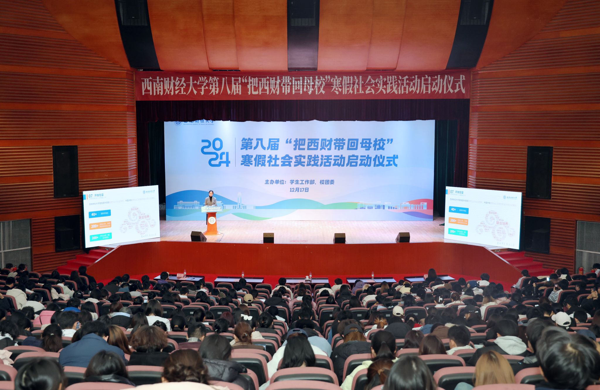 12月17日,西南財經大學第八屆“把西財帶回母校”寒假社會實踐活動啟動儀式在學生活動中心800人廳舉行。學校黨委副書記明海峰出席儀式,學生工作部、校團委負責人,社會實踐隊伍代表參加儀式。