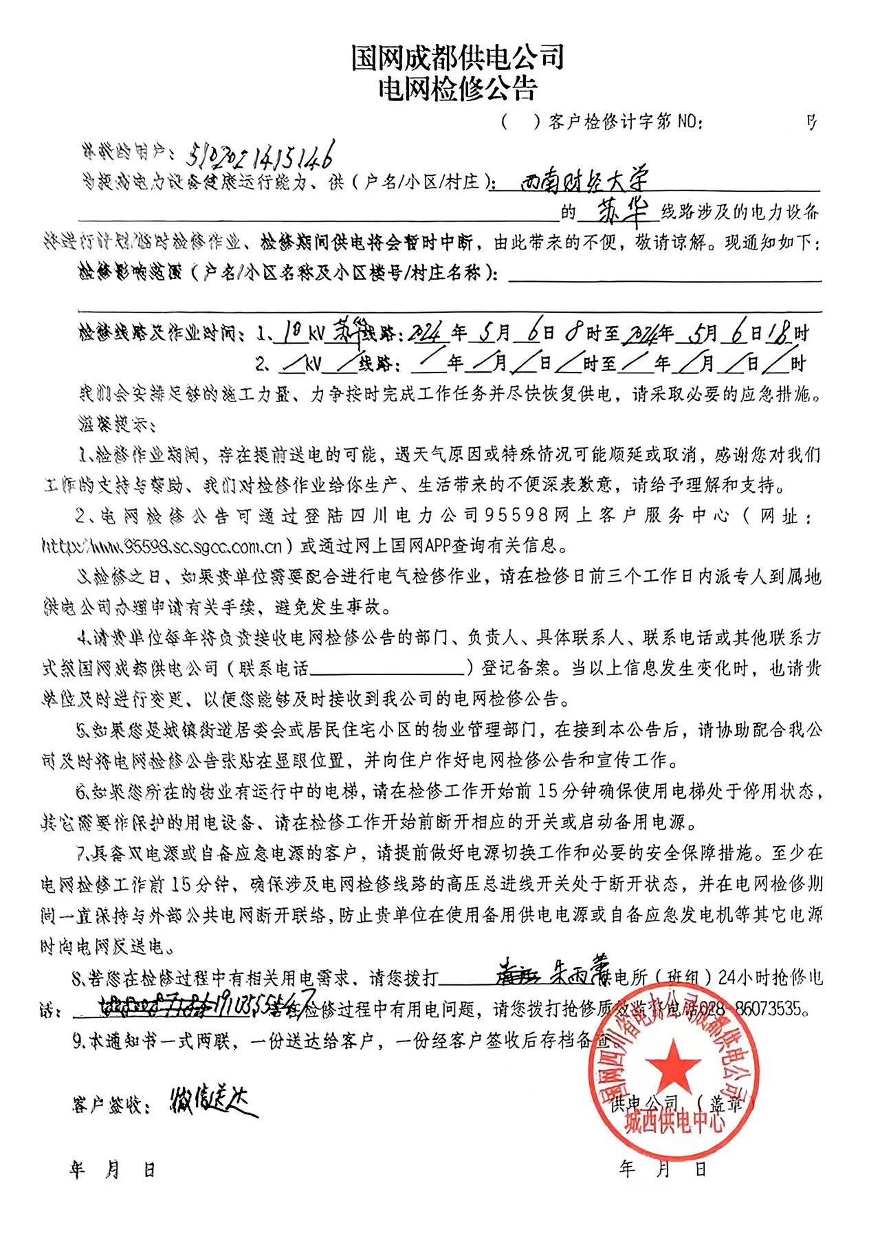 接城西供電中心通知,因負荷改接,光華校區將于5月6日停電。