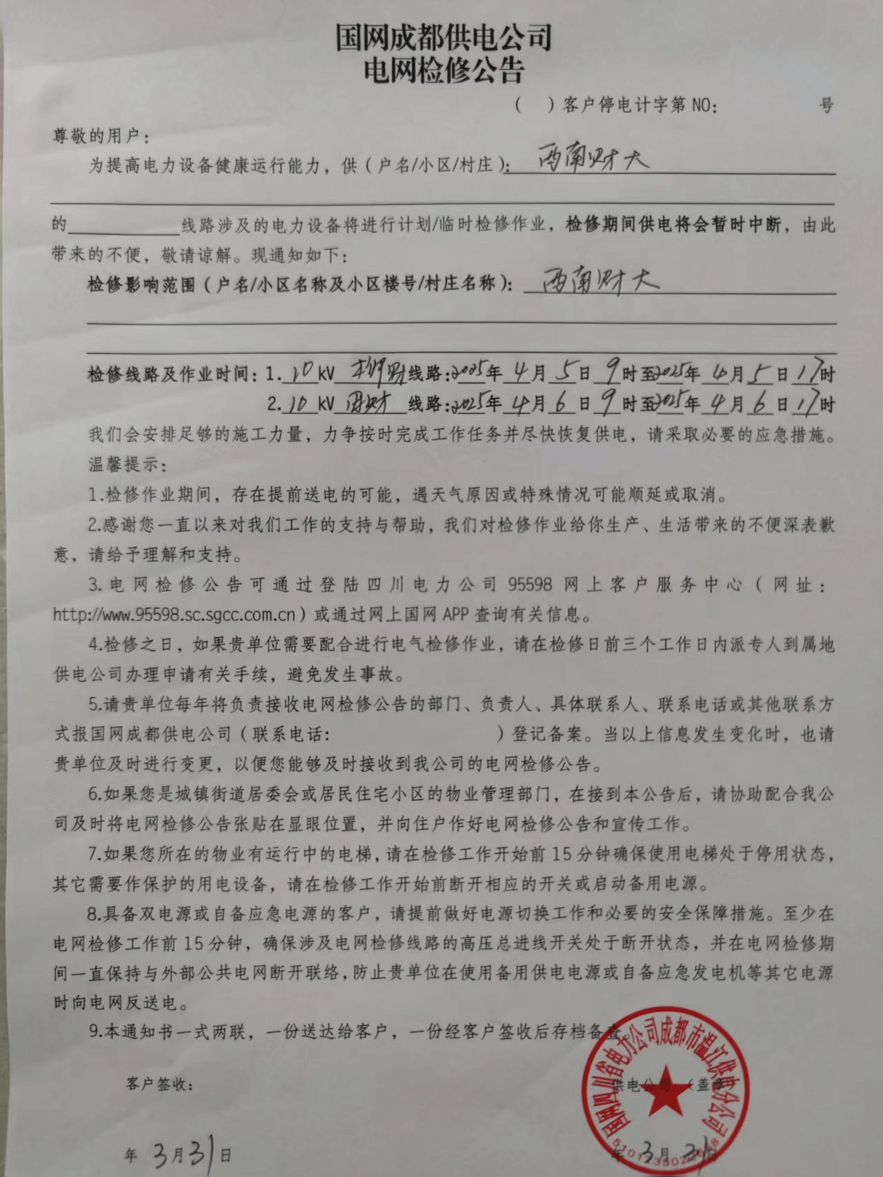 接溫江供電公司通知,因電網(wǎng)檢修計(jì)劃停電。