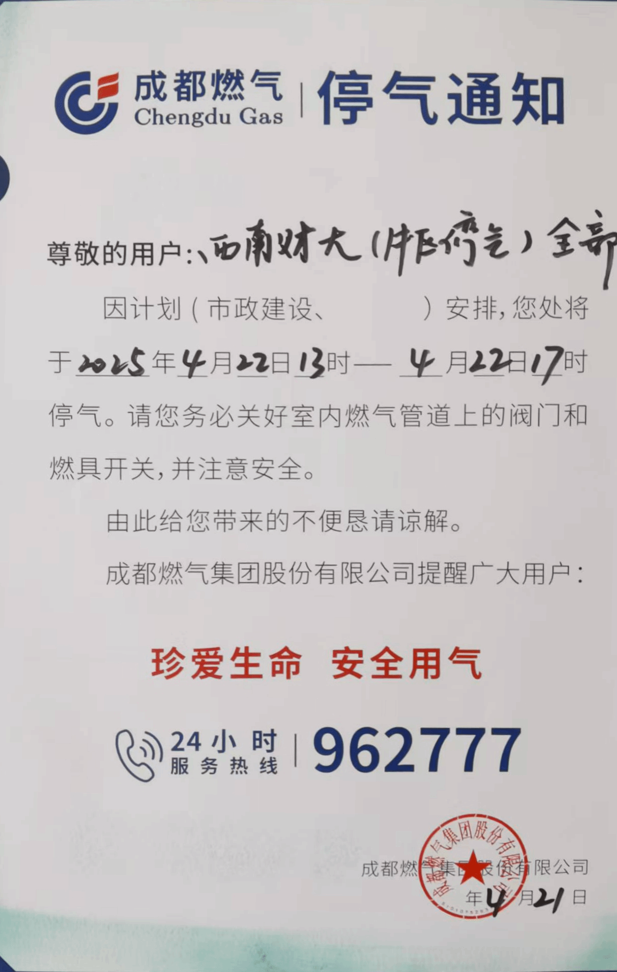 接成都燃氣公司通知,因市政建設,光華校區臨時停氣。