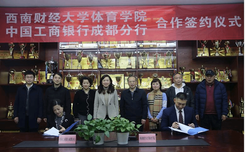 1月21日下午,西南財經大學體育學院與中國工商銀行成都分行合作簽約儀式暨體育科學論文報告會在學校柳林校區光華體育館會議室舉行。中國工商銀行成都分行副行長何逸、機構部副總經理郭茜、大運金融服務中心副總經理王剛、溫江支行行長何曉濤、副行長徐佳,西南財經大學黨委常委、副校長李永強,體育學院院長兼直屬黨支部書記楊遠波,財務處副處長廖濤,體育學院的副院長周正宏、副院長陰濤,以及體育學院全體教師出席本次簽約儀式。簽約儀式由體育學院院長助理毛艷主持。