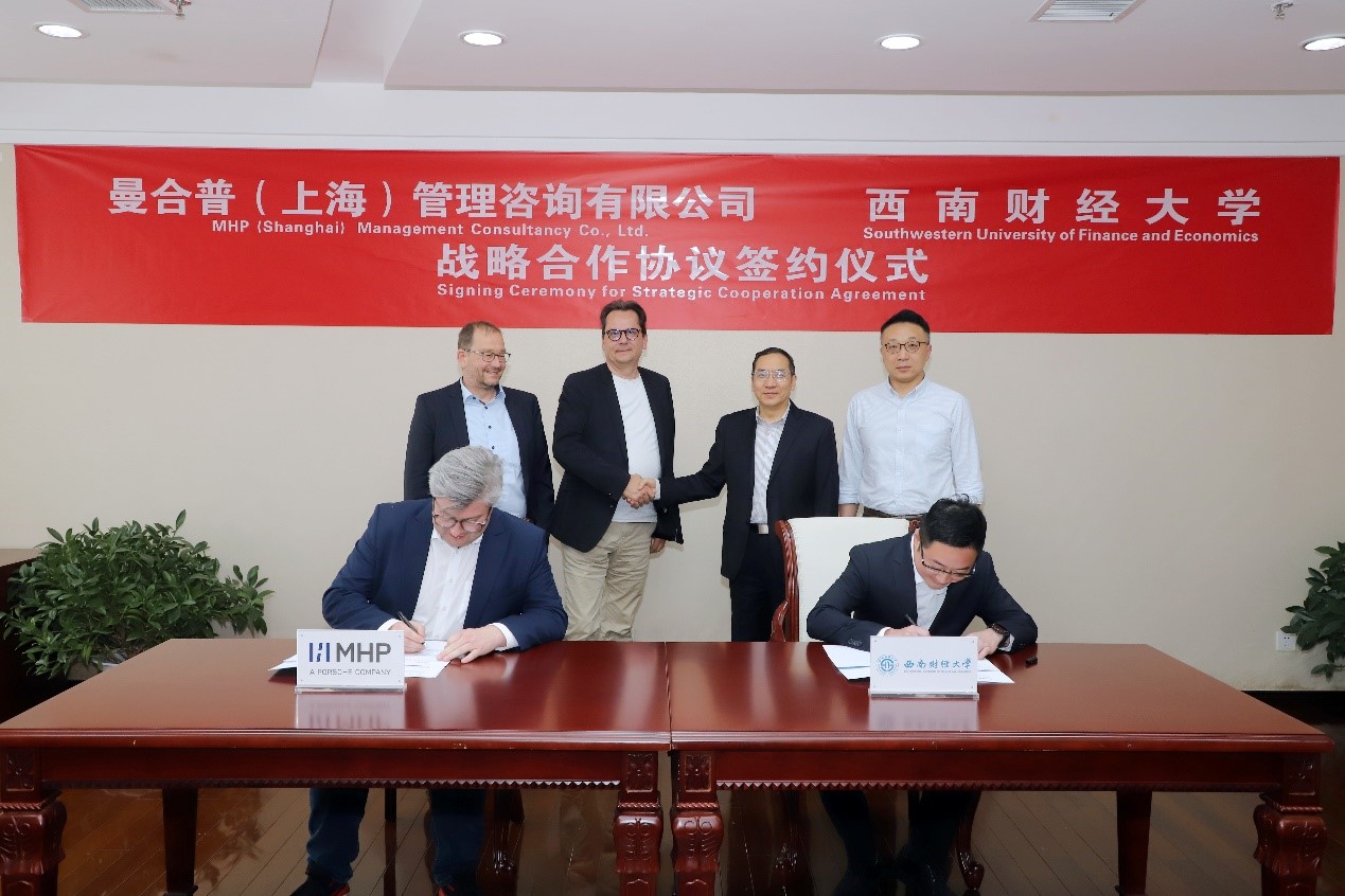 4月23日下午,我校與保時(shí)捷子公司曼合普(上海)管理咨詢有限公司(以下簡(jiǎn)稱“MHP”)戰(zhàn)略合作協(xié)議簽約儀式在柳林校區(qū)騰驤樓5樓會(huì)議室舉行。MHP首席財(cái)務(wù)官、董事會(huì)成員Marc Zimmermann,MHP國際部總裁、董事會(huì)成員Dr. Oliver Oswald,中國區(qū)首席執(zhí)行官Thomas Mooser等,學(xué)校黨委常委、副校長(zhǎng)史代敏,工商管理學(xué)院院長(zhǎng)王玨、副院長(zhǎng)廖毅等雙方代表出席儀式。